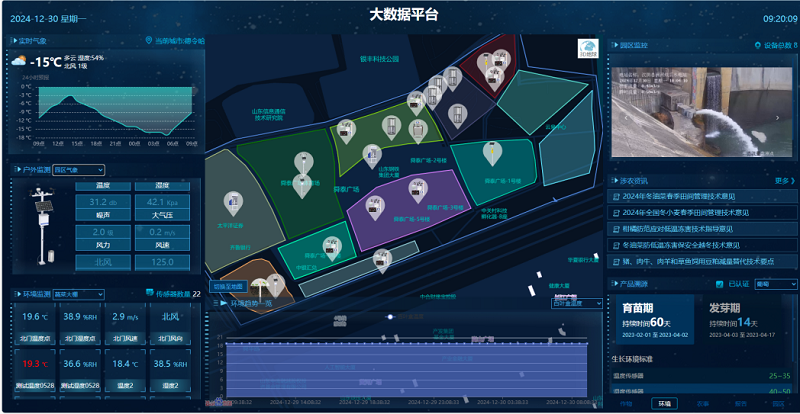 平臺的大屏可視化界面能(neng)夠科(ke)技直觀的輪顯園區內(nei)設備數據和(he)曲線,同時展現了園區的天氣狀(zhuang)況、地圖規劃和(he)設備點位(wei)、攝像頭畫面、農業資訊、溯源信(xin)息(xi)等,功能(neng)強大的同時,視覺上(shang)炫酷高級,信(xin)息(xi)上(shang)直觀突出(chu),達到了科(ke)技感與(yu)實用性并存的效果。