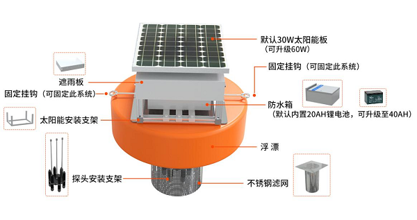 太陽能(neng)(neng)浮漂水質監測站基礎支(zhi)架(jia)由浮漂、不銹鋼濾網、探(tan)頭安(an)裝(zhuang)支(zhi)架(jia)、太陽能(neng)(neng)安(an)裝(zhuang)支(zhi)架(jia)、防水箱、遮雨板組成。
