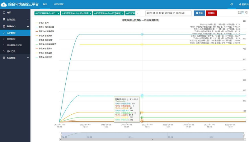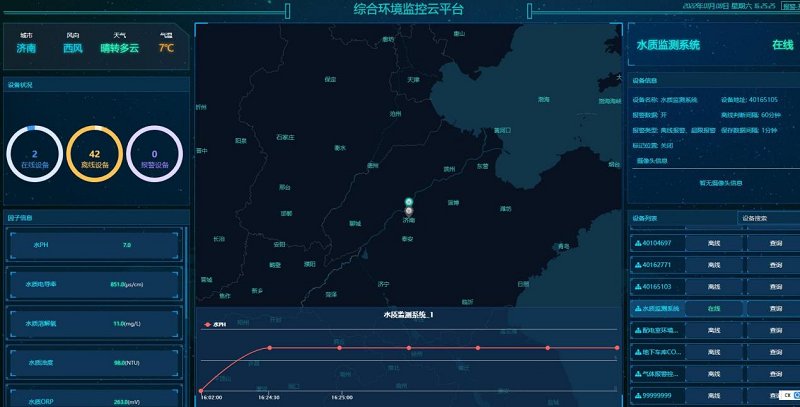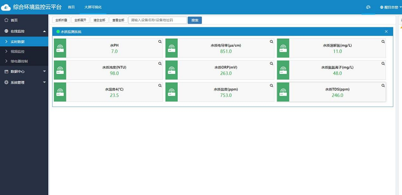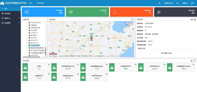 平臺支(zhi)持(chi)實時查看所測水環境數(shu)據。數(shu)據可(ke)以通過圖形化(hua)界面(mian)、列表等方式反映,圖形化(hua)界面(mian)的(de)優(you)勢在于讓用戶直觀看到數(shu)據和傳(chuan)感(gan)器相對(dui)位置,列表則(ze)更利(li)于用戶對(dui)數(shu)據進行對(dui)比。