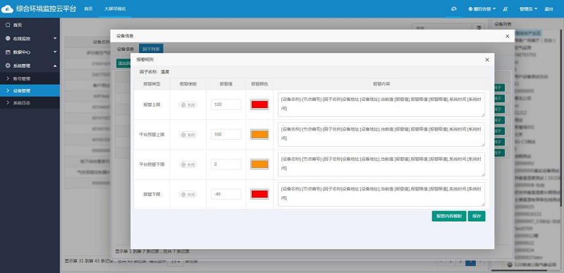 支持所有(you)監測(ce)因(yin)(yin)子報警上(shang)限(xian)、下限(xian),預警上(shang)限(xian)、下限(xian)設置,支持因(yin)(yin)子數據異常字(zi)體(ti)變(bian)色(se),因(yin)(yin)子告警數據顏色(se)用(yong)戶可自定義。